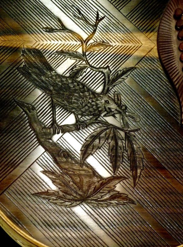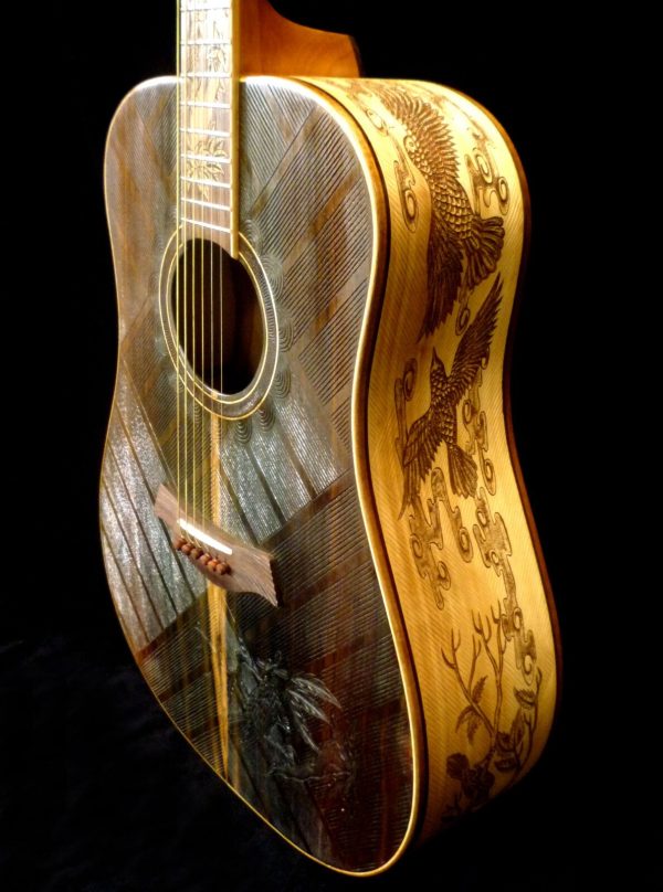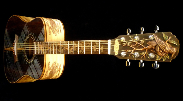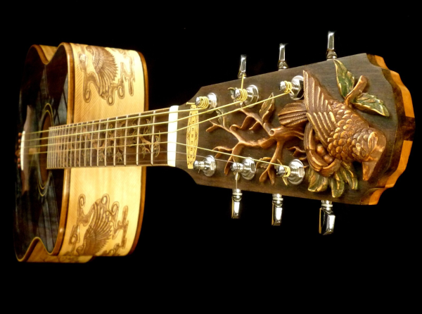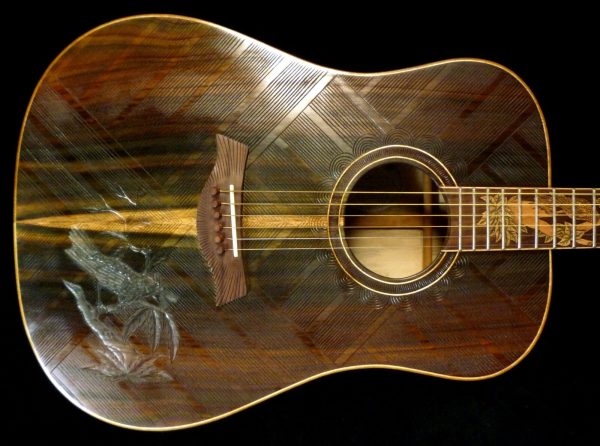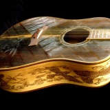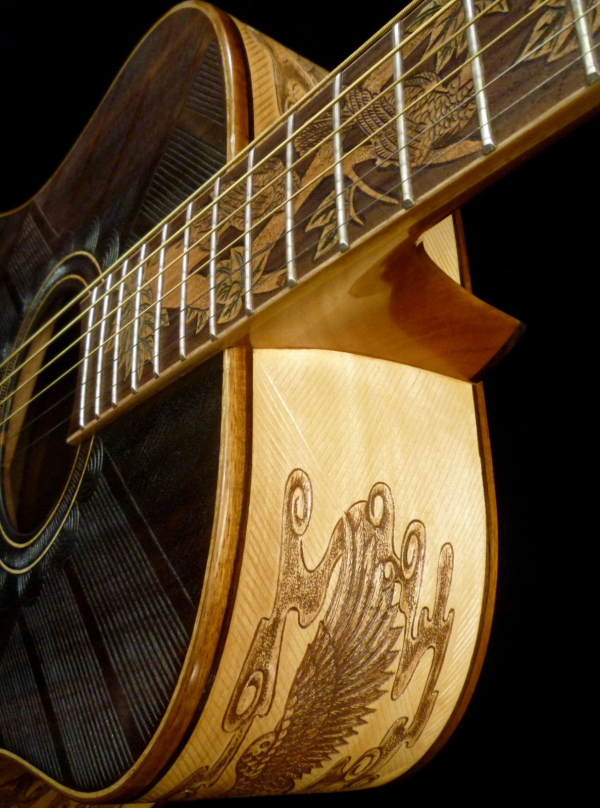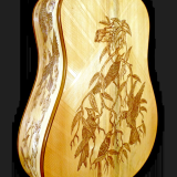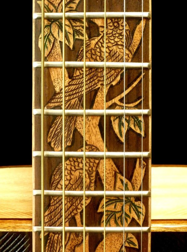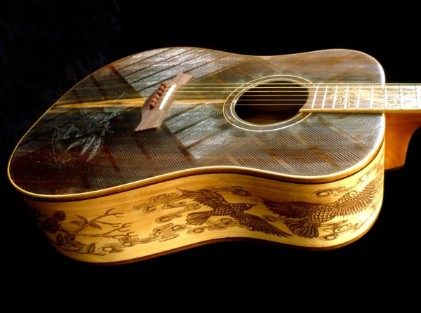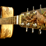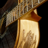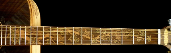 We can carve and inlay names, phrases and initials and we can even carve and inlay designs, faces and scenes from your photographs. Basically, if you can think of it we can get it onto your instrument.