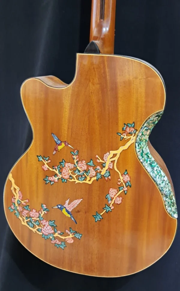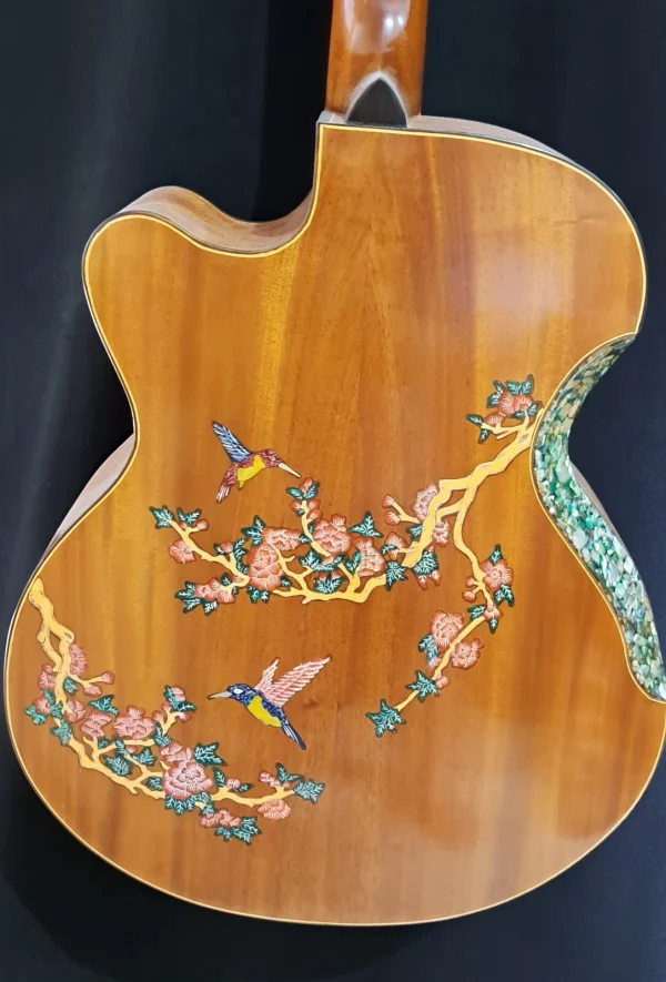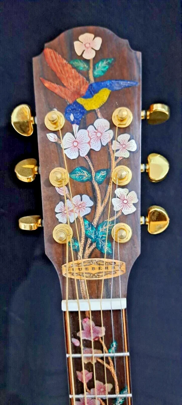 We can carve and inlay names, phrases and initials and we can even carve and inlay designs, faces and scenes from your photographs. Basically, if you can think of it we can get it onto your instrument.