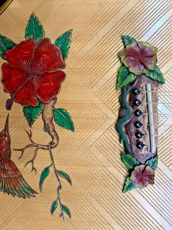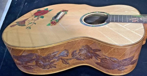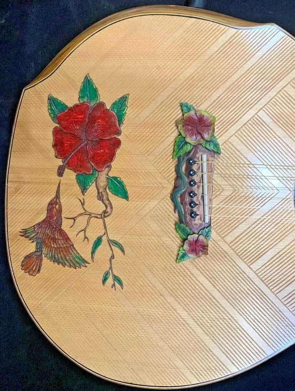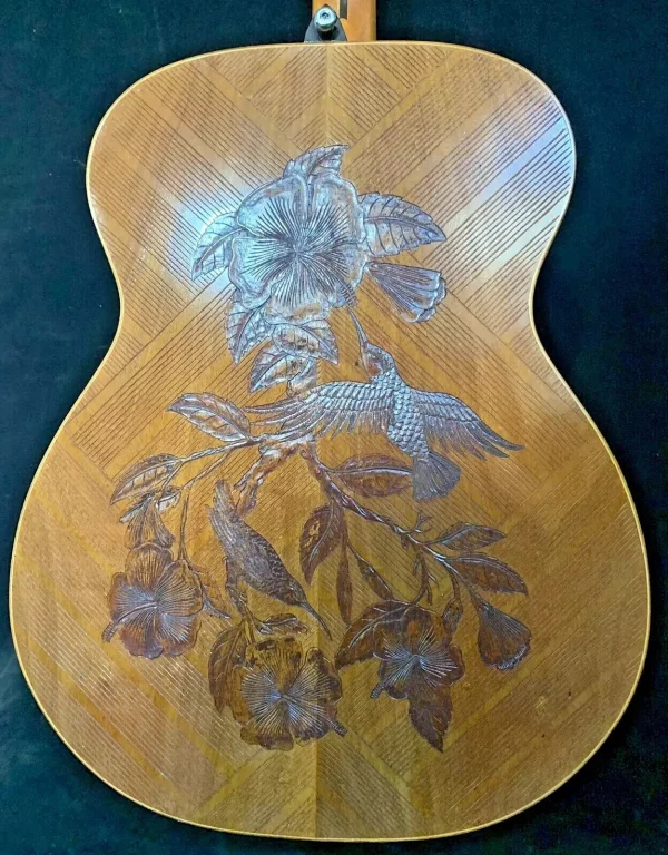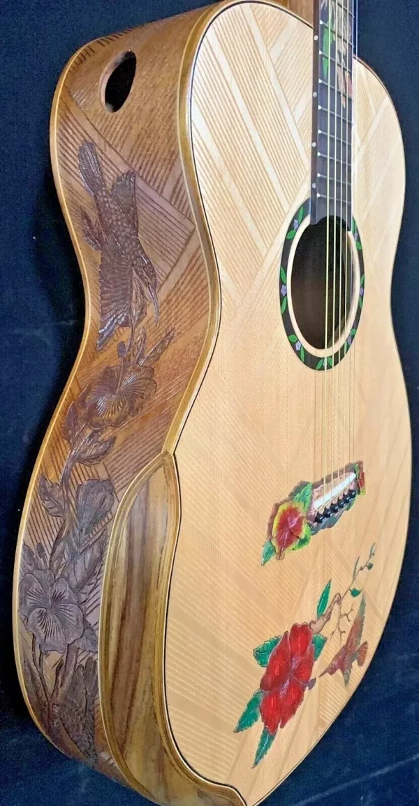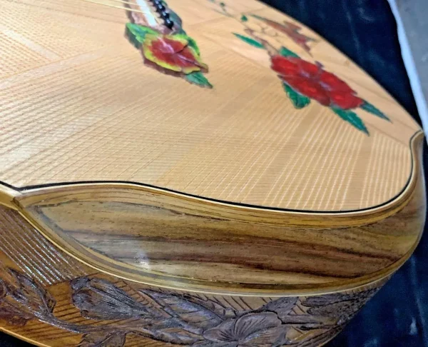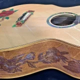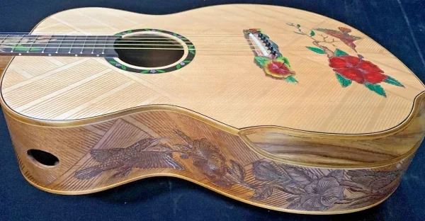 We can carve and inlay names, phrases and initials and we can even carve and inlay designs, faces and scenes from your photographs. Basically, if you can think of it we can get it onto your instrument.