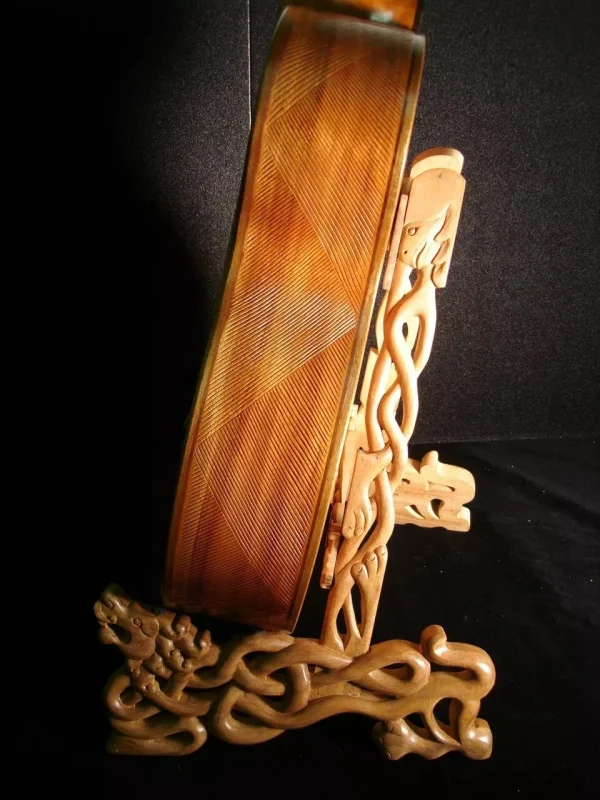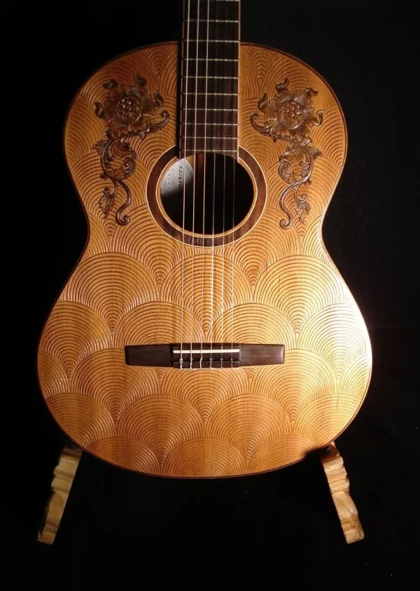 We can carve and inlay names, phrases and initials and we can even carve and inlay designs, faces and scenes from your photographs. Basically, if you can think of it we can get it onto your instrument.