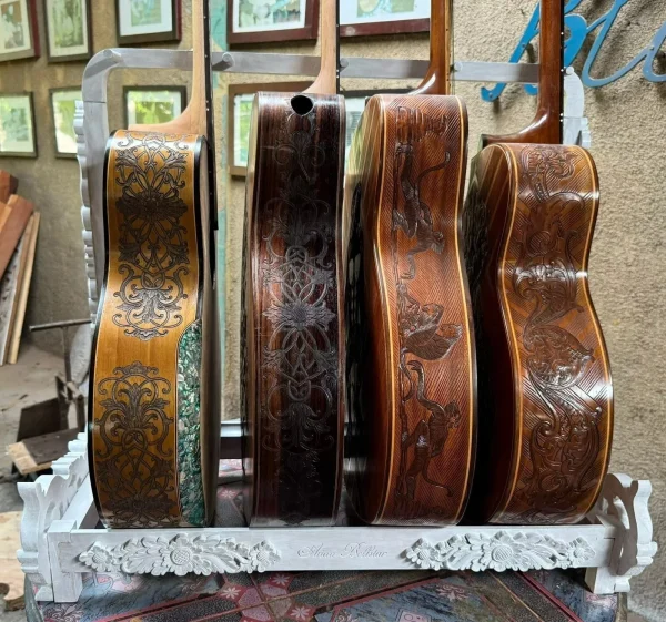 We can carve and inlay names, phrases and initials and we can even carve and inlay designs, faces and scenes from your photographs. Basically, if you can think of it we can get it onto your instrument.