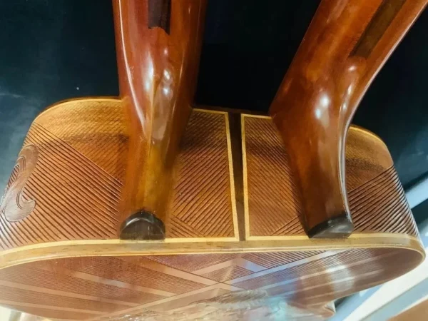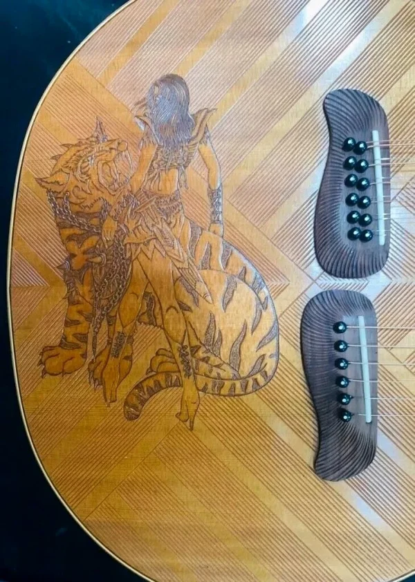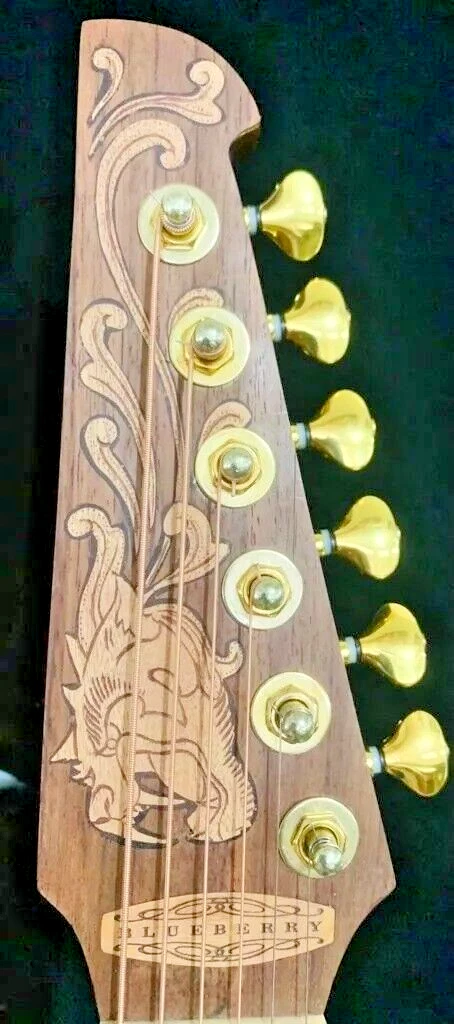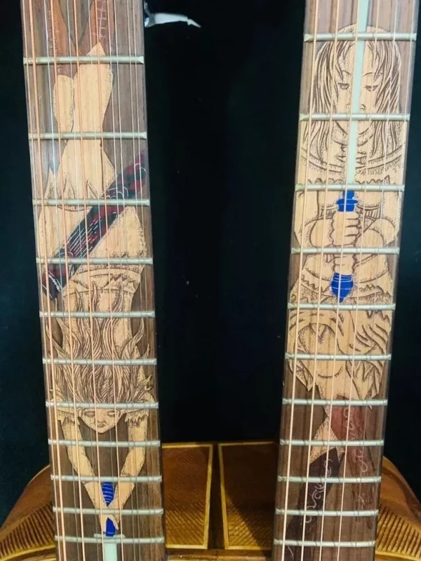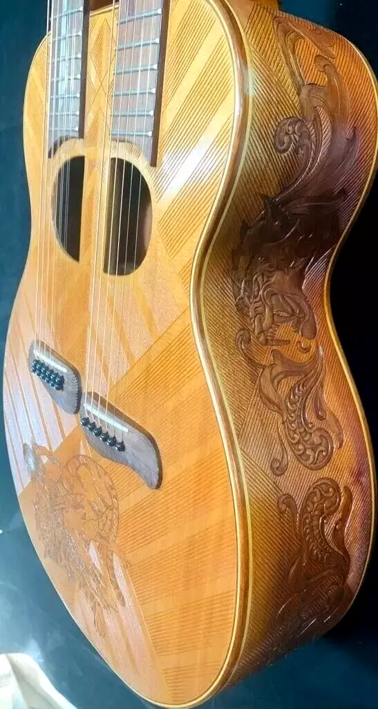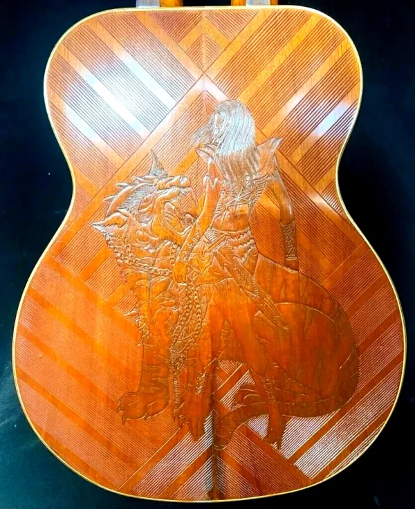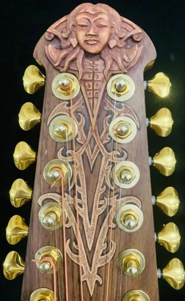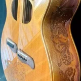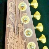 We can carve and inlay names, phrases and initials and we can even carve and inlay designs, faces and scenes from your photographs. Basically, if you can think of it we can get it onto your instrument.