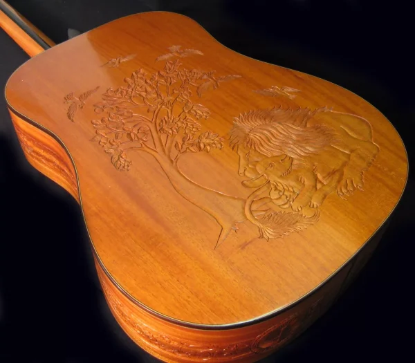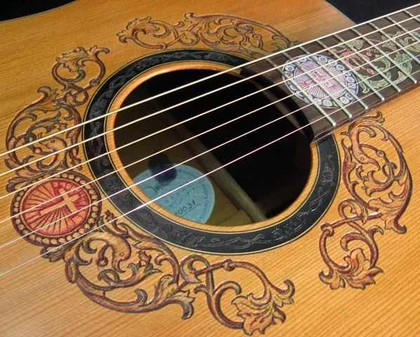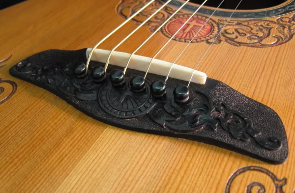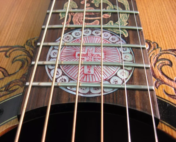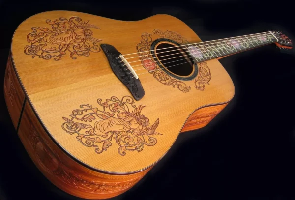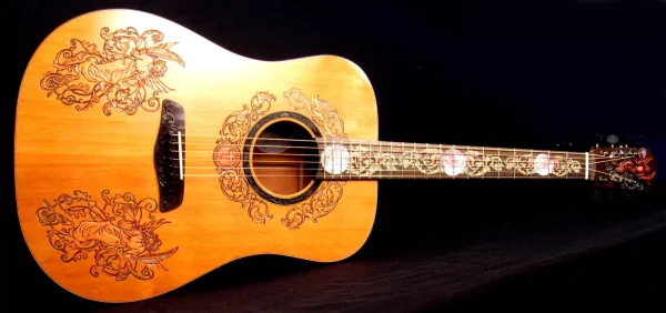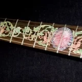 We can carve and inlay names, phrases and initials and we can even carve and inlay designs, faces and scenes from your photographs. Basically, if you can think of it we can get it onto your instrument.