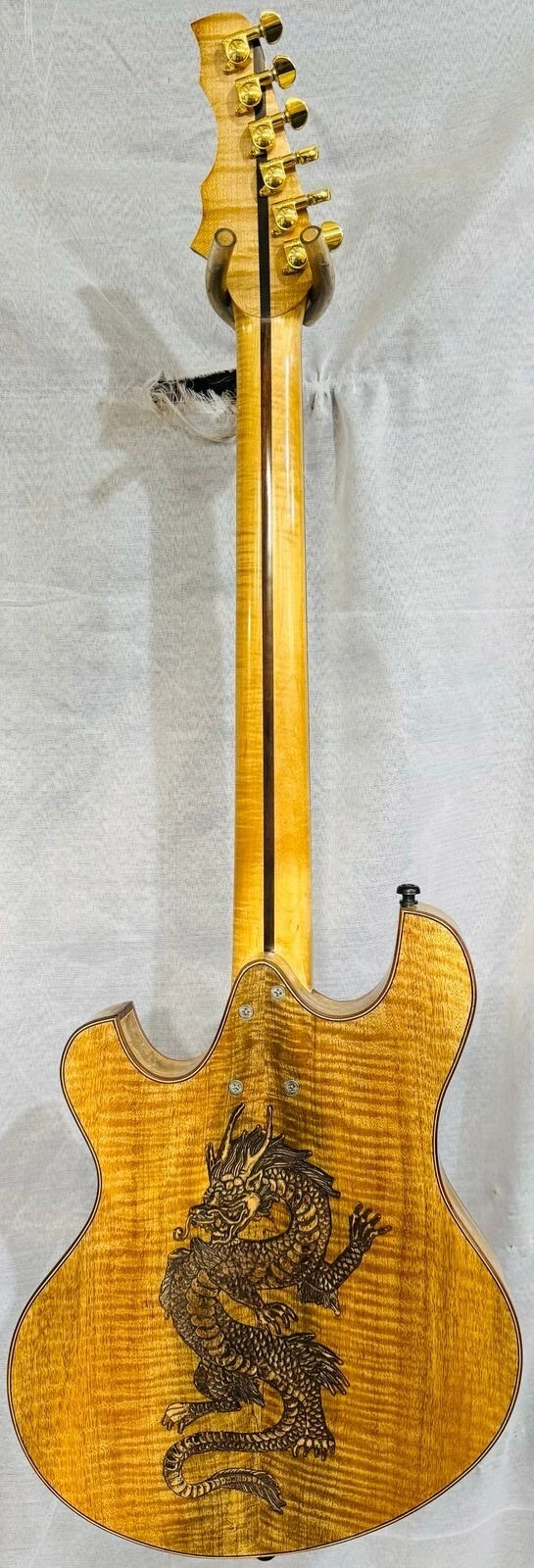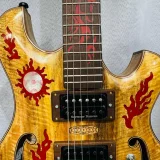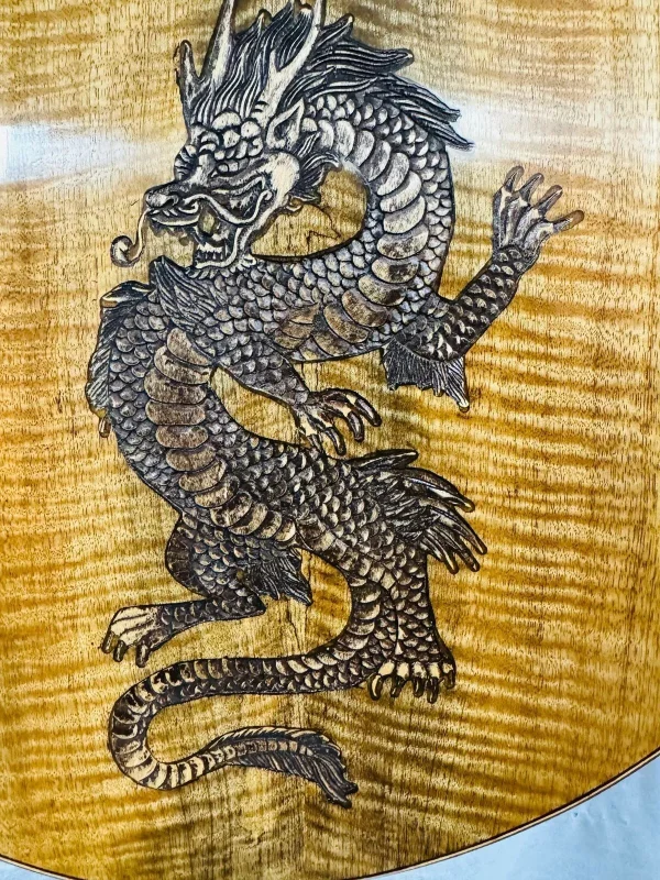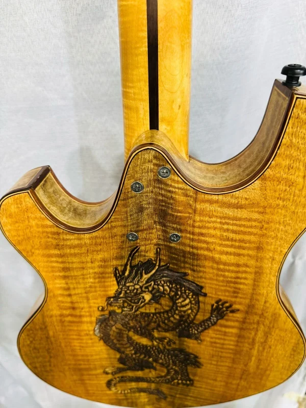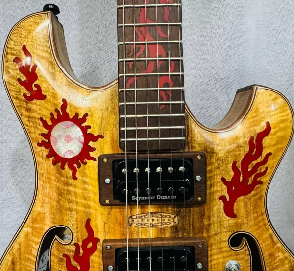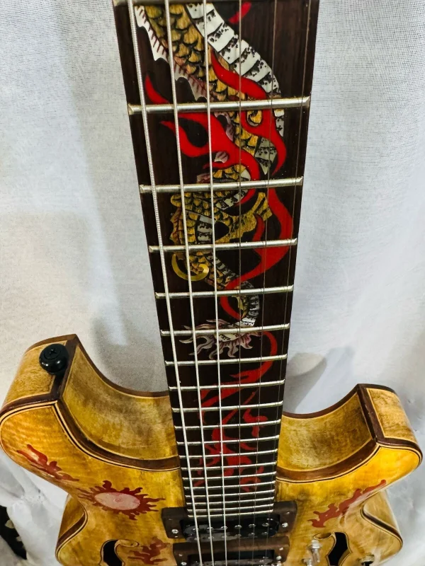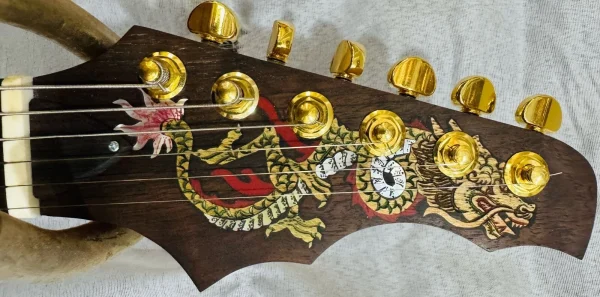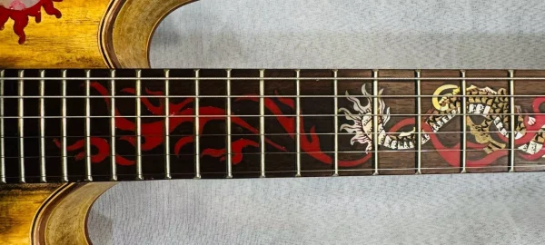 We can carve and inlay names, phrases and initials and we can even carve and inlay designs, faces and scenes from your photographs. Basically, if you can think of it we can get it onto your instrument.