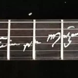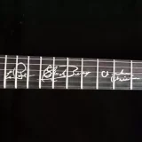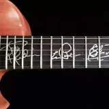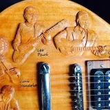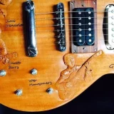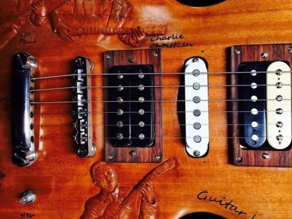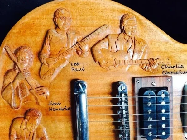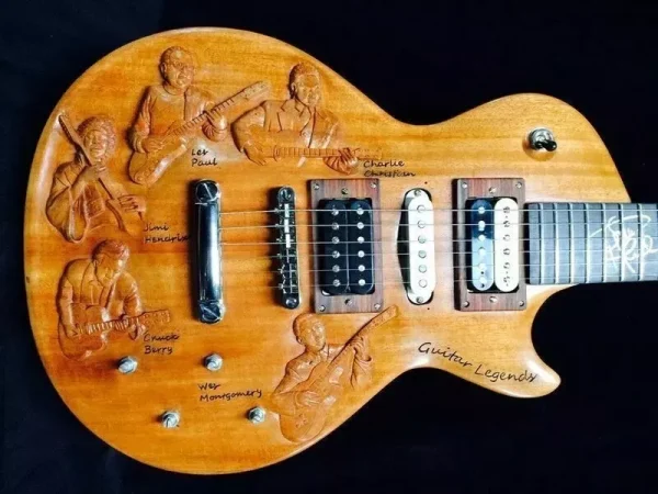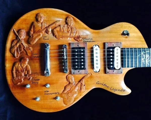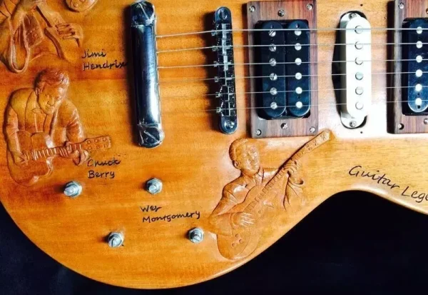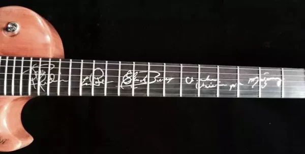 Carved onto the top and inlaid into the fretboard are the images and signatures of Wes Montgomery, Chuck Berry,