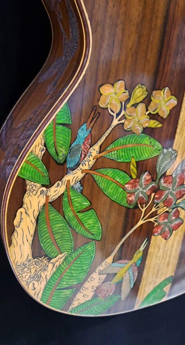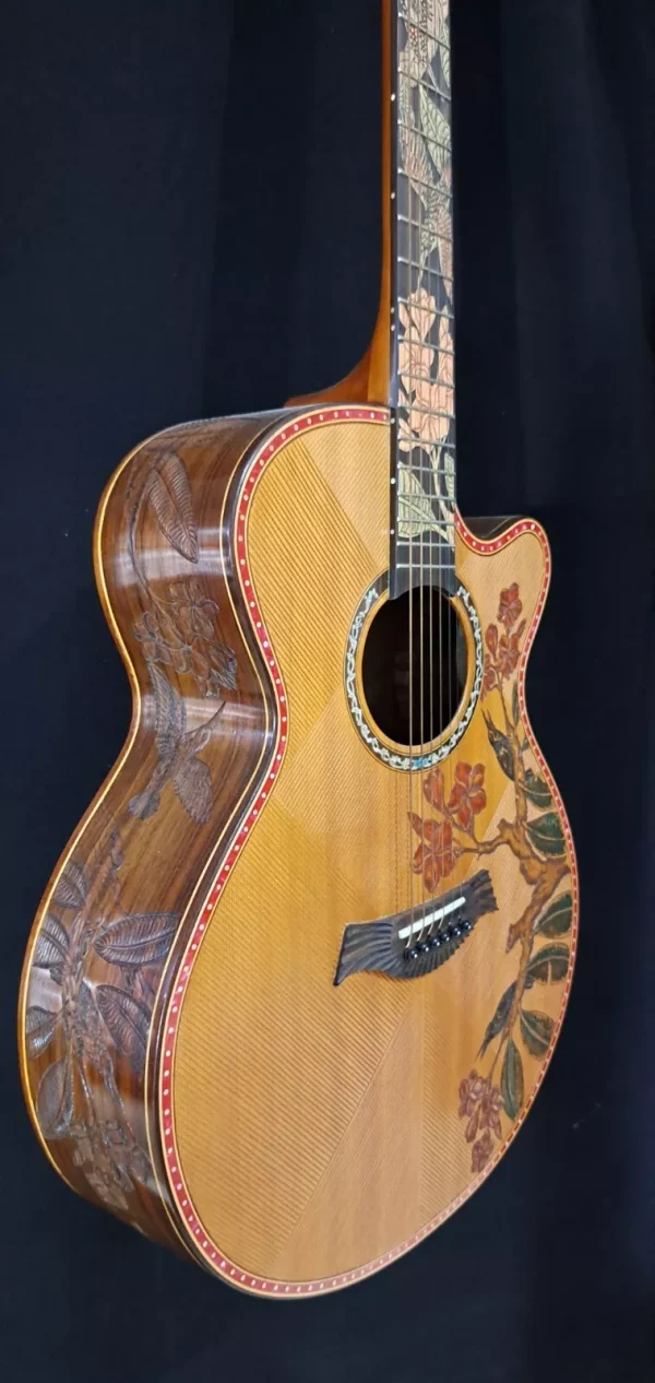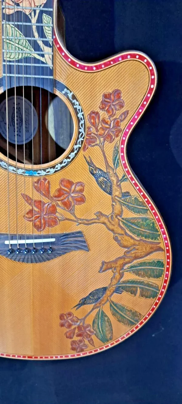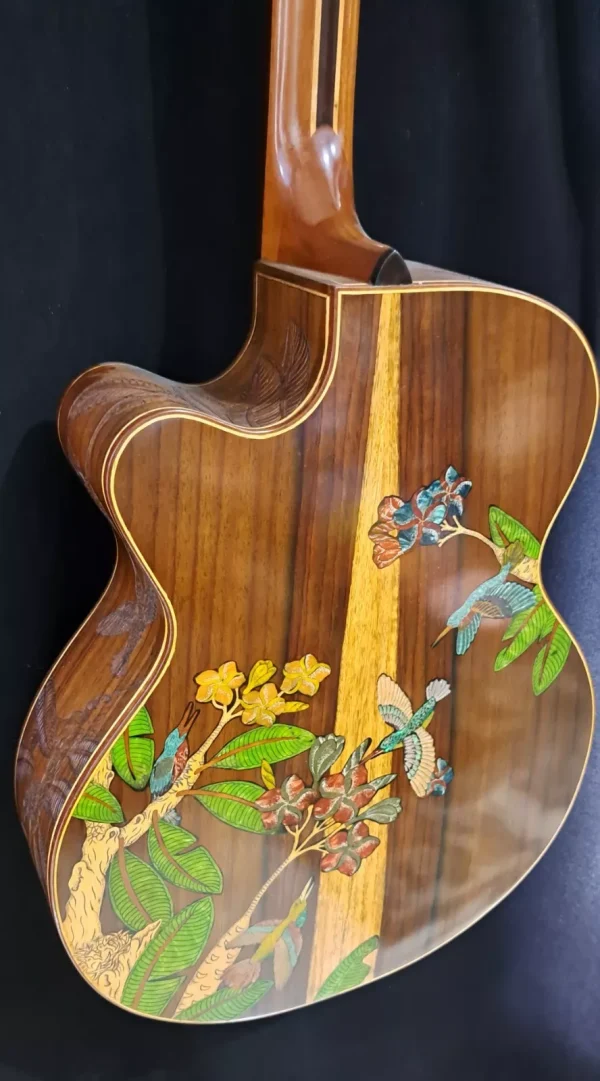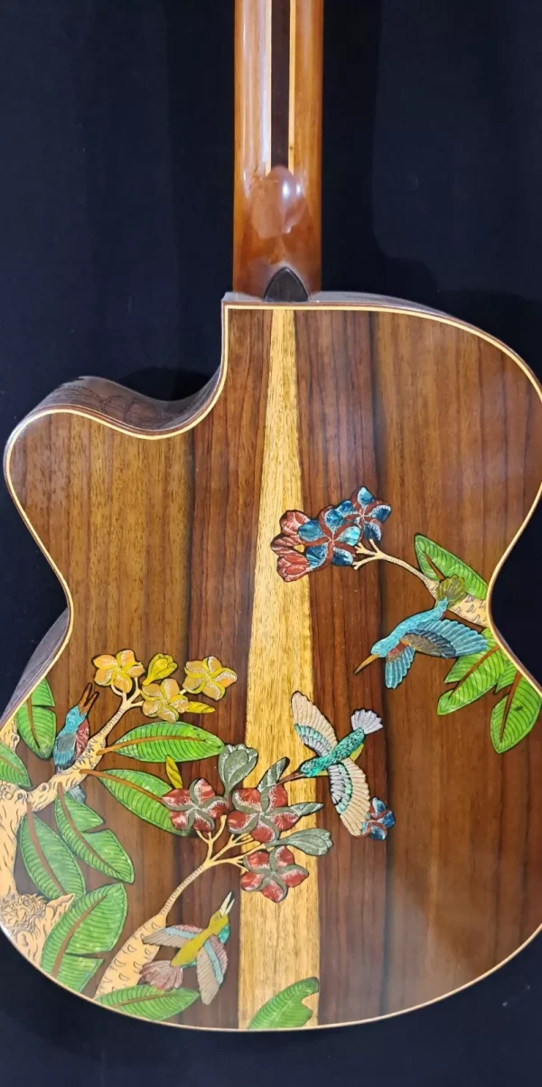 We can carve and inlay names, phrases and initials and we can even carve and inlay designs, faces and scenes from your photographs. Basically, if you can think of it we can get it onto your instrument.