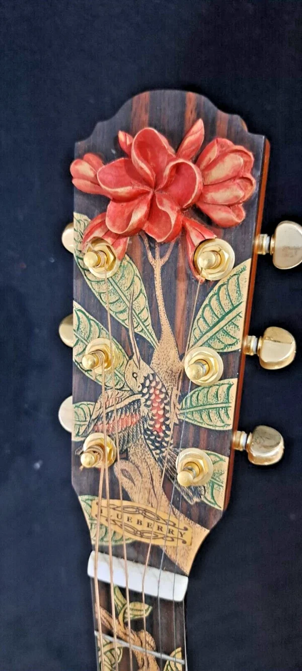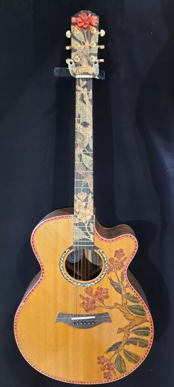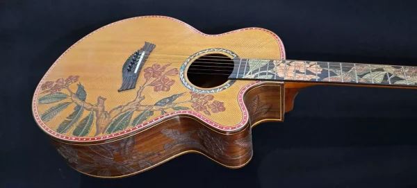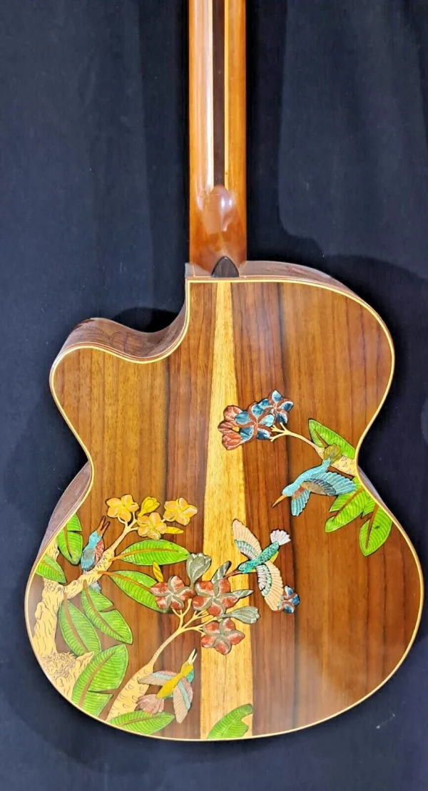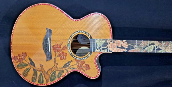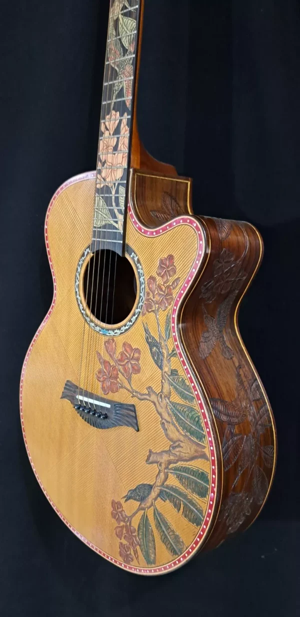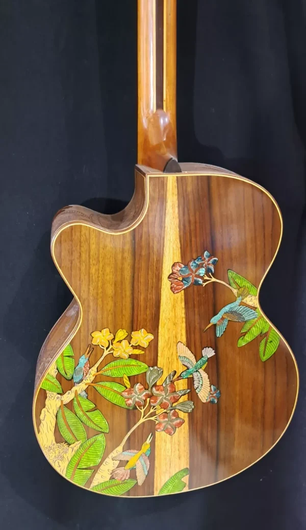 We can carve and inlay names, phrases and initials and we can even carve and inlay designs, faces and scenes from your photographs. Basically, if you can think of it we can get it onto your instrument.