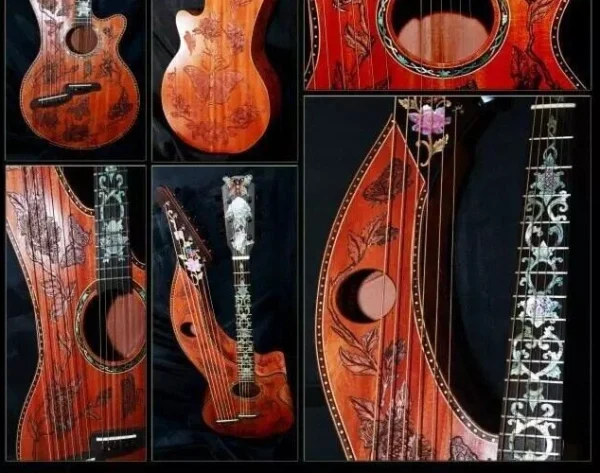We can carve and inlay names, phrases and initials and we can even carve and inlay designs, faces and scenes from your photographs. Basically, if you can think of it we can get it onto your instrument.