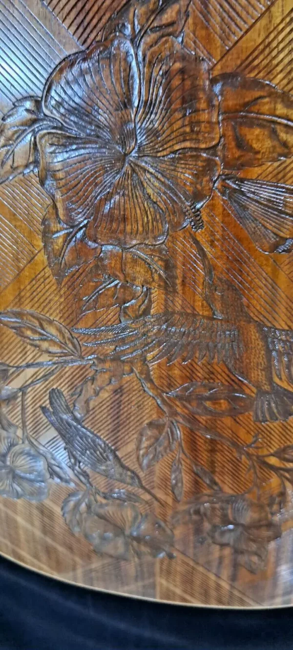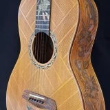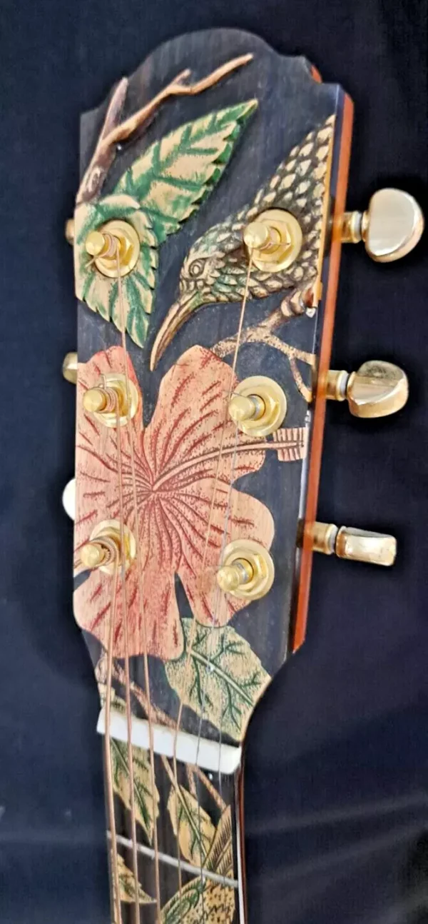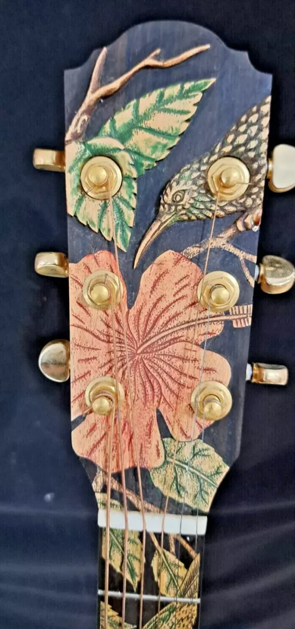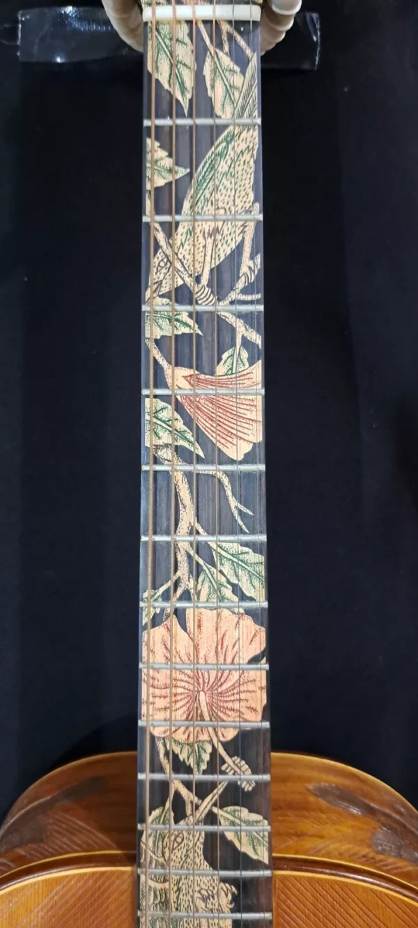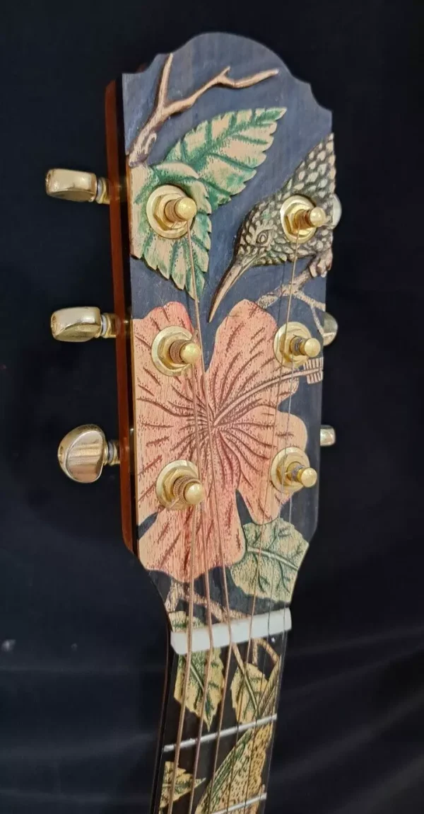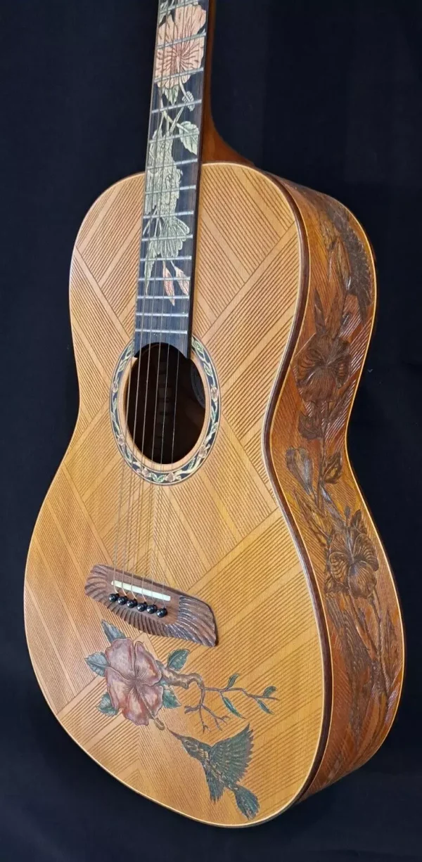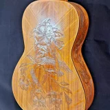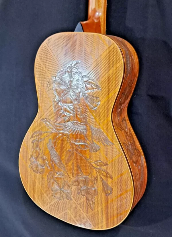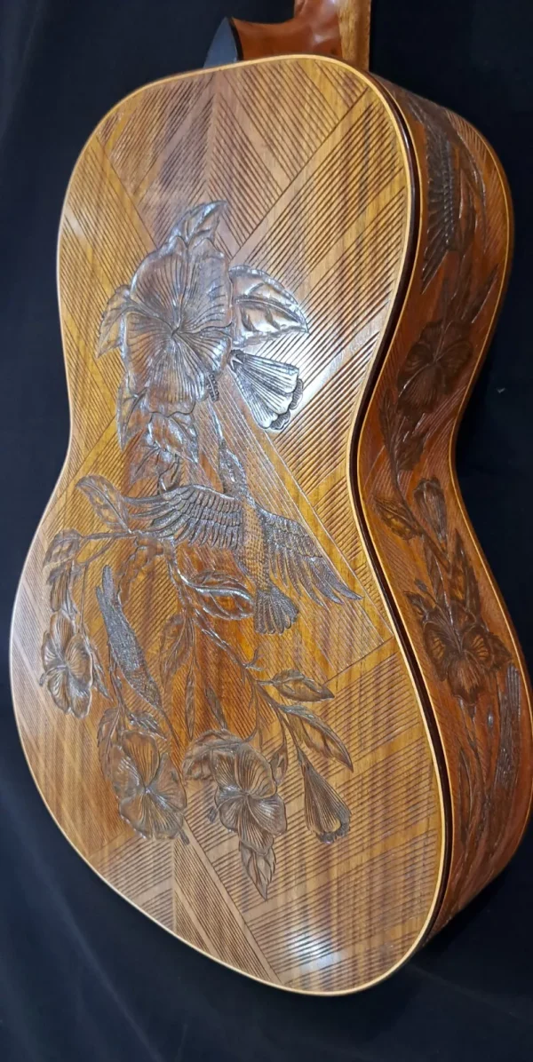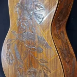 We can carve and inlay names, phrases and initials and we can even carve and inlay designs, faces and scenes from your photographs. Basically, if you can think of it we can get it onto your instrument.